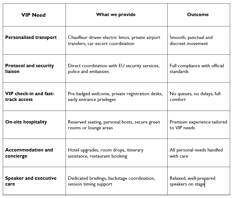 Protocol compliance: From EU-level diplomatic protocol to corporate executive standards, we navigate formalities so you don’t have to.
